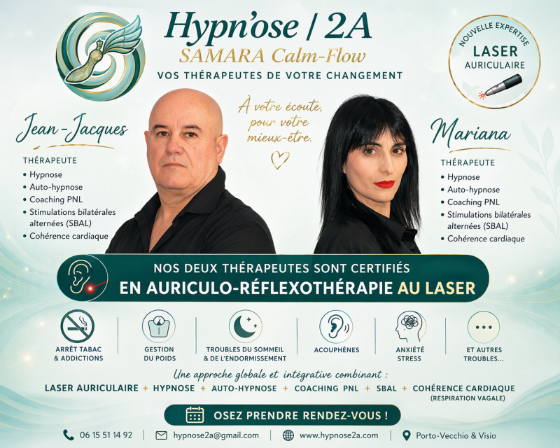 Hypn'ose2A est un cabinet d'hypnose thérapeutique, d'EMDR, de coaching PNL et de thérapies brèves à Porto-Vecchio en Corse du Sud spécialisé dans l'accompagnement des troubles anxieux, de l'angoisse, du stress chronique et des blocages émotionnels. Nous prenons également en charge les addictions, les phobies et également les dépendances affectives, les traumatismes, les abus, BURNOUT… Nos expériences et nos compétences cumulées nous permettent de vous prendre en charge en totale sécurité. Notre approche respectueuse du rythme de chacun vous permettra d'apprendre à réguler vos surcharges émotionnelles et vous permettra de réguler votre système nerveux, votre niveau de stress et votre sécurité intérieure. Les séances que nous proposons sont en Co-intervention (deux thérapeutes). L'objectif n'est pas de forcer le changement mais de vous permettre de créer tous les conditions dans lesquelles il devient possible. Chez hypn'ose2a nous privilégions la posture, l'écoute attentive et le respect.